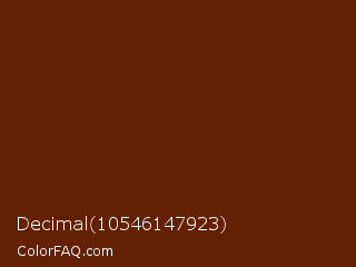 Decimal 10546147923 Color is a very dark orange color and the nearest color is Redwood #5d1e0f. Hex code #642005 and RGB value is rgb(100,32,5). In RGB color space, this color is composed of 39% red, 13% green, 2% blue, In CMYK color space, this color is composed of 0% cyan, 68% magenta, 95% yellow , 61% black , In HSL color space, this color has a hue angle of 17° , 90% saturation and 21% lightness.