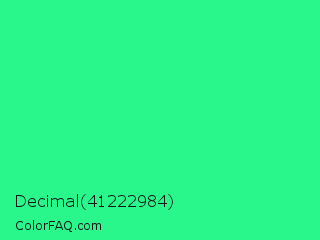 Decimal 41222984 Color is a normal green color and the nearest color is Medium Spring Green #00fa9a. Hex code #29f78c and RGB value is rgb(41,247,140). In RGB color space, this color is composed of 16% red, 97% green, 55% blue, In CMYK color space, this color is composed of 83% cyan, 0% magenta, 43% yellow , 3% black , In HSL color space, this color has a hue angle of 149° , 93% saturation and 56% lightness.