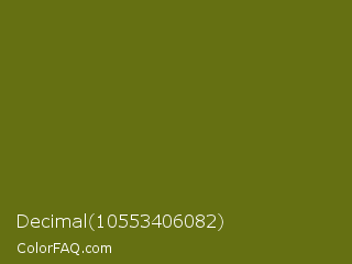 Decimal 10553406082 Color is a dark yellow color and the nearest color is Olivetone #716e10. Hex code #657012 and RGB value is rgb(101,112,18). In RGB color space, this color is composed of 40% red, 44% green, 7% blue, In CMYK color space, this color is composed of 10% cyan, 0% magenta, 84% yellow , 56% black , In HSL color space, this color has a hue angle of 67° , 72% saturation and 25% lightness.