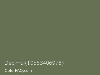 Decimal 10553406978 Color is a normal green color and the nearest color is Siam #646a54. Hex code #657152 and RGB value is rgb(101,113,82). In RGB color space, this color is composed of 40% red, 44% green, 32% blue, In CMYK color space, this color is composed of 11% cyan, 0% magenta, 27% yellow , 56% black , In HSL color space, this color has a hue angle of 83° , 16% saturation and 38% lightness.