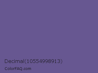 Decimal 10554998913 Color is a normal indigo color and the nearest color is Butterfly Bush #624e9a. Hex code #675791 and RGB value is rgb(103,87,145). In RGB color space, this color is composed of 40% red, 34% green, 57% blue, In CMYK color space, this color is composed of 29% cyan, 40% magenta, 0% yellow , 43% black , In HSL color space, this color has a hue angle of 257° , 25% saturation and 45% lightness.