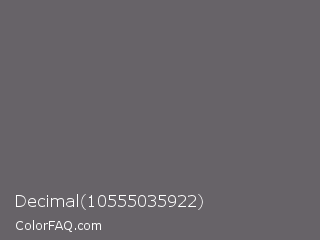Decimal 10555035922 Color is a normal purple color and the nearest color is Granite Gray #676767. Hex code #676368 and RGB value is rgb(103,99,104). In RGB color space, this color is composed of 40% red, 39% green, 41% blue, In CMYK color space, this color is composed of 1% cyan, 5% magenta, 0% yellow , 59% black , In HSL color space, this color has a hue angle of 288° , 2% saturation and 40% lightness.