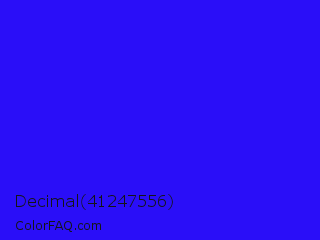 Decimal 41247556 Color is a normal indigo color and the nearest color is Bluebonnet #1c1cf0. Hex code #2a0ef8 and RGB value is rgb(42,14,248). In RGB color space, this color is composed of 16% red, 5% green, 97% blue, In CMYK color space, this color is composed of 83% cyan, 94% magenta, 0% yellow , 3% black , In HSL color space, this color has a hue angle of 247° , 94% saturation and 51% lightness.