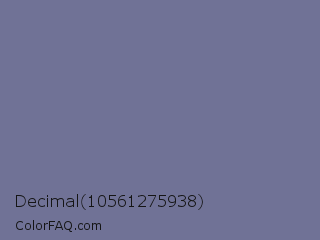 Decimal 10561275938 Color is a normal blue color and the nearest color is Rhythm #777696. Hex code #707296 and RGB value is rgb(112,114,150). In RGB color space, this color is composed of 44% red, 45% green, 59% blue, In CMYK color space, this color is composed of 25% cyan, 24% magenta, 0% yellow , 41% black , In HSL color space, this color has a hue angle of 237° , 15% saturation and 51% lightness.