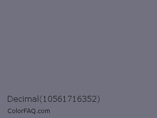 Decimal 10561716352 Color is a normal blue color and the nearest color is Storm Gray #717486. Hex code #717180 and RGB value is rgb(113,113,128). In RGB color space, this color is composed of 44% red, 44% green, 50% blue, In CMYK color space, this color is composed of 12% cyan, 12% magenta, 0% yellow , 50% black , In HSL color space, this color has a hue angle of 240° , 6% saturation and 47% lightness.
