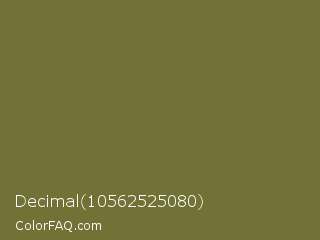 Decimal 10562525080 Color is a normal yellow color and the nearest color is Pesto #7c7631. Hex code #727236 and RGB value is rgb(114,114,54). In RGB color space, this color is composed of 45% red, 45% green, 21% blue, In CMYK color space, this color is composed of 0% cyan, 0% magenta, 53% yellow , 55% black , In HSL color space, this color has a hue angle of 60° , 36% saturation and 33% lightness.