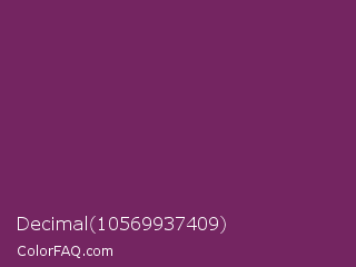 Decimal 10569937409 Color is a dark magenta color and the nearest color is Byzantium #702963. Hex code #742561 and RGB value is rgb(116,37,97). In RGB color space, this color is composed of 45% red, 15% green, 38% blue, In CMYK color space, this color is composed of 0% cyan, 68% magenta, 16% yellow , 55% black , In HSL color space, this color has a hue angle of 314° , 52% saturation and 30% lightness.