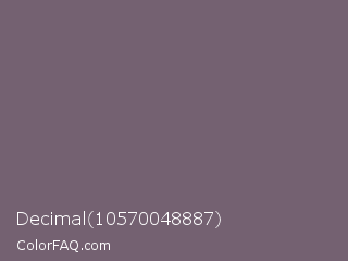 Decimal 10570048887 Color is a normal magenta color and the nearest color is Old Lavender #796878. Hex code #746171 and RGB value is rgb(116,97,113). In RGB color space, this color is composed of 45% red, 38% green, 44% blue, In CMYK color space, this color is composed of 0% cyan, 16% magenta, 3% yellow , 55% black , In HSL color space, this color has a hue angle of 309° , 9% saturation and 42% lightness.