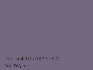 Decimal 10570056580 Color is a normal violet color and the nearest color is Old Lavender #796878. Hex code #746880 and RGB value is rgb(116,104,128). In RGB color space, this color is composed of 45% red, 41% green, 50% blue, In CMYK color space, this color is composed of 9% cyan, 19% magenta, 0% yellow , 50% black , In HSL color space, this color has a hue angle of 270° , 10% saturation and 45% lightness.