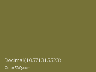 Decimal 10571315523 Color is a normal yellow color and the nearest color is Pesto #7c7631. Hex code #767237 and RGB value is rgb(118,114,55). In RGB color space, this color is composed of 46% red, 45% green, 22% blue, In CMYK color space, this color is composed of 0% cyan, 3% magenta, 53% yellow , 54% black , In HSL color space, this color has a hue angle of 56° , 36% saturation and 34% lightness.