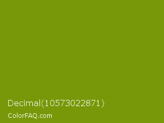Decimal 10573022871 Color is a normal lime color and the nearest color is Limeade #6f9d02. Hex code #789809 and RGB value is rgb(120,152,9). In RGB color space, this color is composed of 47% red, 60% green, 4% blue, In CMYK color space, this color is composed of 21% cyan, 0% magenta, 94% yellow , 40% black , In HSL color space, this color has a hue angle of 73° , 89% saturation and 32% lightness.