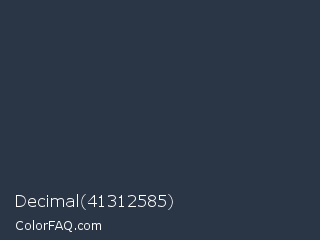 Decimal 41312585 Color is a very dark blue color and the nearest color is Tuna #353542. Hex code #2a3545 and RGB value is rgb(42,53,69). In RGB color space, this color is composed of 16% red, 21% green, 27% blue, In CMYK color space, this color is composed of 39% cyan, 23% magenta, 0% yellow , 73% black , In HSL color space, this color has a hue angle of 216° , 24% saturation and 22% lightness.