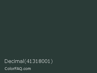 Decimal 41318001 Color is a very dark cyan color and the nearest color is Outer Space Crayola #2d383a. Hex code #2a3b37 and RGB value is rgb(42,59,55). In RGB color space, this color is composed of 16% red, 23% green, 22% blue, In CMYK color space, this color is composed of 29% cyan, 0% magenta, 7% yellow , 77% black , In HSL color space, this color has a hue angle of 166° , 17% saturation and 20% lightness.