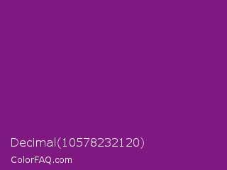 Decimal 10578232120 Color is a dark magenta color and the nearest color is Seance #731e8f. Hex code #801882 and RGB value is rgb(128,24,130). In RGB color space, this color is composed of 50% red, 9% green, 51% blue, In CMYK color space, this color is composed of 2% cyan, 82% magenta, 0% yellow , 49% black , In HSL color space, this color has a hue angle of 299° , 69% saturation and 30% lightness.