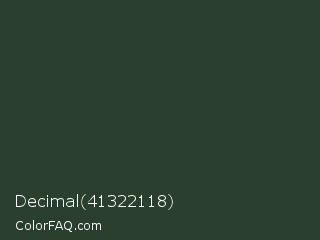 Decimal 41322118 Color is a very dark green color and the nearest color is Kombu Green #354230. Hex code #2a3f2e and RGB value is rgb(42,63,46). In RGB color space, this color is composed of 16% red, 25% green, 18% blue, In CMYK color space, this color is composed of 33% cyan, 0% magenta, 27% yellow , 75% black , In HSL color space, this color has a hue angle of 131° , 20% saturation and 21% lightness.