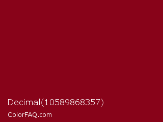 Decimal 10589868357 Color is a dark red color and the nearest color is Pohutukawa #8f021c. Hex code #880319 and RGB value is rgb(136,3,25). In RGB color space, this color is composed of 53% red, 1% green, 10% blue, In CMYK color space, this color is composed of 0% cyan, 98% magenta, 82% yellow , 47% black , In HSL color space, this color has a hue angle of 350° , 96% saturation and 27% lightness.