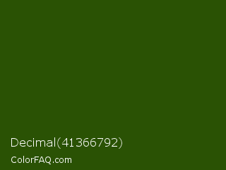 Decimal 41366792 Color is a very dark green color and the nearest color is Green House #24500f. Hex code #2a5204 and RGB value is rgb(42,82,4). In RGB color space, this color is composed of 16% red, 32% green, 2% blue, In CMYK color space, this color is composed of 49% cyan, 0% magenta, 95% yellow , 68% black , In HSL color space, this color has a hue angle of 91° , 91% saturation and 17% lightness.