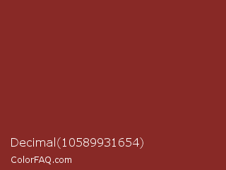 Decimal 10589931654 Color is a normal red color and the nearest color is Burnt Umber #8a3324. Hex code #882926 and RGB value is rgb(136,41,38). In RGB color space, this color is composed of 53% red, 16% green, 15% blue, In CMYK color space, this color is composed of 0% cyan, 70% magenta, 72% yellow , 47% black , In HSL color space, this color has a hue angle of 2° , 56% saturation and 34% lightness.