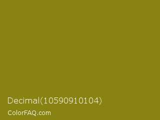 Decimal 10590910104 Color is a dark yellow color and the nearest color is Trendy Green #7c881a. Hex code #898412 and RGB value is rgb(137,132,18). In RGB color space, this color is composed of 54% red, 52% green, 7% blue, In CMYK color space, this color is composed of 0% cyan, 4% magenta, 87% yellow , 46% black , In HSL color space, this color has a hue angle of 57° , 77% saturation and 30% lightness.