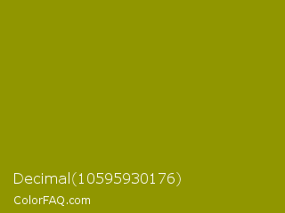 Decimal 10595930176 Color is a dark yellow color and the nearest color is Dark Yellow #9b870c. Hex code #909600 and RGB value is rgb(144,150,0). In RGB color space, this color is composed of 56% red, 59% green, 0% blue, In CMYK color space, this color is composed of 4% cyan, 0% magenta, 100% yellow , 41% black , In HSL color space, this color has a hue angle of 62° , 100% saturation and 29% lightness.