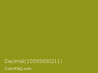 Decimal 10595930211 Color is a normal yellow color and the nearest color is Dark Yellow #9b870c. Hex code #909617 and RGB value is rgb(144,150,23). In RGB color space, this color is composed of 56% red, 59% green, 9% blue, In CMYK color space, this color is composed of 4% cyan, 0% magenta, 85% yellow , 41% black , In HSL color space, this color has a hue angle of 63° , 73% saturation and 34% lightness.