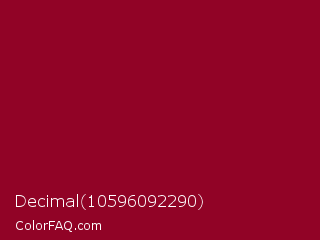 Decimal 10596092290 Color is a dark red color and the nearest color is Paprika #8d0226. Hex code #910326 and RGB value is rgb(145,3,38). In RGB color space, this color is composed of 57% red, 1% green, 15% blue, In CMYK color space, this color is composed of 0% cyan, 98% magenta, 74% yellow , 43% black , In HSL color space, this color has a hue angle of 345° , 96% saturation and 29% lightness.