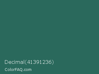 Decimal 41391236 Color is a dark cyan color and the nearest color is Casal #2f6168. Hex code #2a695c and RGB value is rgb(42,105,92). In RGB color space, this color is composed of 16% red, 41% green, 36% blue, In CMYK color space, this color is composed of 60% cyan, 0% magenta, 12% yellow , 59% black , In HSL color space, this color has a hue angle of 168° , 43% saturation and 29% lightness.