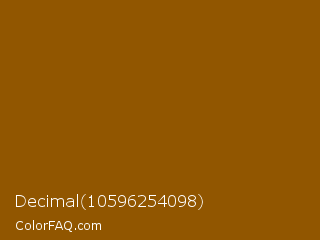 Decimal 10596254098 Color is a dark orange color and the nearest color is Brown #964b00. Hex code #915600 and RGB value is rgb(145,86,0). In RGB color space, this color is composed of 57% red, 34% green, 0% blue, In CMYK color space, this color is composed of 0% cyan, 41% magenta, 100% yellow , 43% black , In HSL color space, this color has a hue angle of 36° , 100% saturation and 28% lightness.