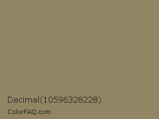 Decimal 10596328228 Color is a normal orange color and the nearest color is Clay Creek #8a8360. Hex code #918564 and RGB value is rgb(145,133,100). In RGB color space, this color is composed of 57% red, 52% green, 39% blue, In CMYK color space, this color is composed of 0% cyan, 8% magenta, 31% yellow , 43% black , In HSL color space, this color has a hue angle of 44° , 18% saturation and 48% lightness.