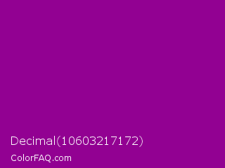 Decimal 10603217172 Color is a dark magenta color and the nearest color is Dark Magenta #8b008b. Hex code #920192 and RGB value is rgb(146,1,146). In RGB color space, this color is composed of 57% red, 0% green, 57% blue, In CMYK color space, this color is composed of 0% cyan, 99% magenta, 0% yellow , 43% black , In HSL color space, this color has a hue angle of 300° , 99% saturation and 29% lightness.