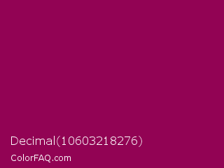 Decimal 10603218276 Color is a dark magenta color and the nearest color is Cardinal Pink #8c055e. Hex code #920354 and RGB value is rgb(146,3,84). In RGB color space, this color is composed of 57% red, 1% green, 33% blue, In CMYK color space, this color is composed of 0% cyan, 98% magenta, 42% yellow , 43% black , In HSL color space, this color has a hue angle of 326° , 96% saturation and 29% lightness.