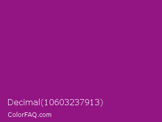 Decimal 10603237913 Color is a normal magenta color and the nearest color is Mardi Gras #880085. Hex code #921583 and RGB value is rgb(146,21,131). In RGB color space, this color is composed of 57% red, 8% green, 51% blue, In CMYK color space, this color is composed of 0% cyan, 86% magenta, 10% yellow , 43% black , In HSL color space, this color has a hue angle of 307° , 75% saturation and 33% lightness.