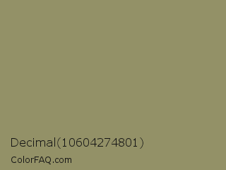 Decimal 10604274801 Color is a normal yellow color and the nearest color is Avocado Pulp #888d65. Hex code #939167 and RGB value is rgb(147,145,103). In RGB color space, this color is composed of 58% red, 57% green, 40% blue, In CMYK color space, this color is composed of 0% cyan, 1% magenta, 30% yellow , 42% black , In HSL color space, this color has a hue angle of 57° , 18% saturation and 49% lightness.