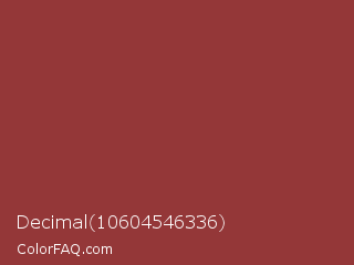 Decimal 10604546336 Color is a normal red color and the nearest color is Stiletto #9c3336. Hex code #943738 and RGB value is rgb(148,55,56). In RGB color space, this color is composed of 58% red, 22% green, 22% blue, In CMYK color space, this color is composed of 0% cyan, 63% magenta, 62% yellow , 42% black , In HSL color space, this color has a hue angle of 359° , 46% saturation and 40% lightness.