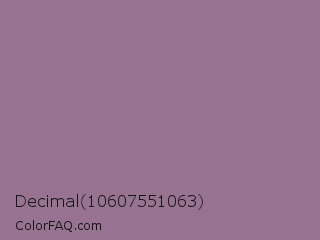 Decimal 10607551063 Color is a normal magenta color and the nearest color is Mountbatten Pink #997a8d. Hex code #987291 and RGB value is rgb(152,114,145). In RGB color space, this color is composed of 60% red, 45% green, 57% blue, In CMYK color space, this color is composed of 0% cyan, 25% magenta, 5% yellow , 40% black , In HSL color space, this color has a hue angle of 311° , 16% saturation and 52% lightness.