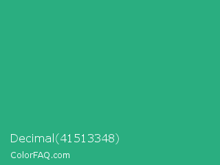 Decimal 41513348 Color is a normal green color and the nearest color is Jungle Green #29ab87. Hex code #2aae80 and RGB value is rgb(42,174,128). In RGB color space, this color is composed of 16% red, 68% green, 50% blue, In CMYK color space, this color is composed of 76% cyan, 0% magenta, 26% yellow , 32% black , In HSL color space, this color has a hue angle of 159° , 61% saturation and 42% lightness.