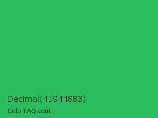 Decimal 41944883 Color is a normal green color and the nearest color is Medium Sea Green #3cb371. Hex code #2abc5d and RGB value is rgb(42,188,93). In RGB color space, this color is composed of 16% red, 74% green, 36% blue, In CMYK color space, this color is composed of 78% cyan, 0% magenta, 51% yellow , 26% black , In HSL color space, this color has a hue angle of 141° , 63% saturation and 45% lightness.