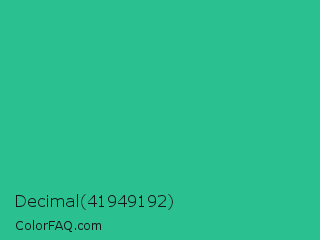 Decimal 41949192 Color is a normal green color and the nearest color is Mountain Meadow #30ba8f. Hex code #2ac090 and RGB value is rgb(42,192,144). In RGB color space, this color is composed of 16% red, 75% green, 56% blue, In CMYK color space, this color is composed of 78% cyan, 0% magenta, 25% yellow , 25% black , In HSL color space, this color has a hue angle of 161° , 64% saturation and 46% lightness.