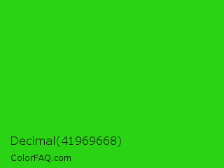 Decimal 41969668 Color is a normal green color and the nearest color is Harlequin Green #46cb18. Hex code #2ad414 and RGB value is rgb(42,212,20). In RGB color space, this color is composed of 16% red, 83% green, 8% blue, In CMYK color space, this color is composed of 80% cyan, 0% magenta, 91% yellow , 17% black , In HSL color space, this color has a hue angle of 113° , 83% saturation and 45% lightness.