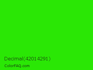 Decimal 42014291 Color is a normal green color and the nearest color is Neon Green #39ff14. Hex code #2ae705 and RGB value is rgb(42,231,5). In RGB color space, this color is composed of 16% red, 91% green, 2% blue, In CMYK color space, this color is composed of 82% cyan, 0% magenta, 98% yellow , 9% black , In HSL color space, this color has a hue angle of 110° , 96% saturation and 46% lightness.