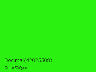 Decimal 42025508 Color is a normal green color and the nearest color is Neon Green #39ff14. Hex code #2af110 and RGB value is rgb(42,241,16). In RGB color space, this color is composed of 16% red, 95% green, 6% blue, In CMYK color space, this color is composed of 83% cyan, 0% magenta, 93% yellow , 5% black , In HSL color space, this color has a hue angle of 113° , 89% saturation and 50% lightness.