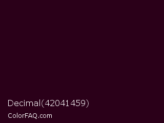 Decimal 42041459 Color is a almost black magenta color and the nearest color is Toledo #3a0020. Hex code #2b0019 and RGB value is rgb(43,0,25). In RGB color space, this color is composed of 17% red, 0% green, 10% blue, In CMYK color space, this color is composed of 0% cyan, 100% magenta, 42% yellow , 83% black , In HSL color space, this color has a hue angle of 325° , 100% saturation and 8% lightness.