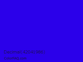 Decimal 42041986 Color is a normal indigo color and the nearest color is Electric Ultramarine #3f00ff. Hex code #2b00ea and RGB value is rgb(43,0,234). In RGB color space, this color is composed of 17% red, 0% green, 92% blue, In CMYK color space, this color is composed of 82% cyan, 100% magenta, 0% yellow , 8% black , In HSL color space, this color has a hue angle of 251° , 100% saturation and 46% lightness.