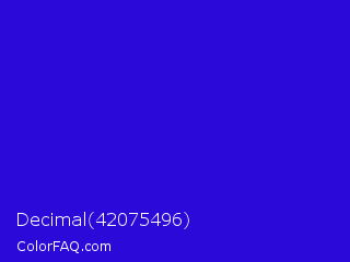 Decimal 42075496 Color is a normal indigo color and the nearest color is Interdimensional Blue #360ccc. Hex code #2b09d8 and RGB value is rgb(43,9,216). In RGB color space, this color is composed of 17% red, 4% green, 85% blue, In CMYK color space, this color is composed of 80% cyan, 96% magenta, 0% yellow , 15% black , In HSL color space, this color has a hue angle of 250° , 92% saturation and 44% lightness.