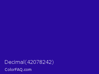 Decimal 42078242 Color is a normal indigo color and the nearest color is Blue Gem #2c0e8c. Hex code #2b0b9e and RGB value is rgb(43,11,158). In RGB color space, this color is composed of 17% red, 4% green, 62% blue, In CMYK color space, this color is composed of 73% cyan, 93% magenta, 0% yellow , 38% black , In HSL color space, this color has a hue angle of 253° , 87% saturation and 33% lightness.