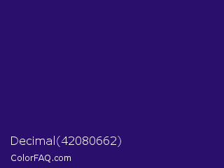 Decimal 42080662 Color is a dark indigo color and the nearest color is Paris M #26056a. Hex code #2b0f6c and RGB value is rgb(43,15,108). In RGB color space, this color is composed of 17% red, 6% green, 42% blue, In CMYK color space, this color is composed of 60% cyan, 86% magenta, 0% yellow , 58% black , In HSL color space, this color has a hue angle of 258° , 76% saturation and 24% lightness.