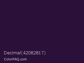 Decimal 42082817 Color is a very dark purple color and the nearest color is Revolver #2c1632. Hex code #2b1039 and RGB value is rgb(43,16,57). In RGB color space, this color is composed of 17% red, 6% green, 22% blue, In CMYK color space, this color is composed of 25% cyan, 72% magenta, 0% yellow , 78% black , In HSL color space, this color has a hue angle of 280° , 56% saturation and 14% lightness.
