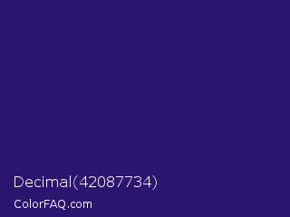 Decimal 42087734 Color is a dark indigo color and the nearest color is Persian Indigo #32127a. Hex code #2b1570 and RGB value is rgb(43,21,112). In RGB color space, this color is composed of 17% red, 8% green, 44% blue, In CMYK color space, this color is composed of 62% cyan, 81% magenta, 0% yellow , 56% black , In HSL color space, this color has a hue angle of 255° , 68% saturation and 26% lightness.