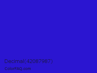 Decimal 42087987 Color is a normal indigo color and the nearest color is Interdimensional Blue #360ccc. Hex code #2b15d1 and RGB value is rgb(43,21,209). In RGB color space, this color is composed of 17% red, 8% green, 82% blue, In CMYK color space, this color is composed of 79% cyan, 90% magenta, 0% yellow , 18% black , In HSL color space, this color has a hue angle of 247° , 82% saturation and 45% lightness.