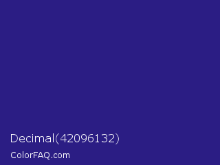 Decimal 42096132 Color is a normal indigo color and the nearest color is Jacksons Purple #20208d. Hex code #2b1d84 and RGB value is rgb(43,29,132). In RGB color space, this color is composed of 17% red, 11% green, 52% blue, In CMYK color space, this color is composed of 67% cyan, 78% magenta, 0% yellow , 48% black , In HSL color space, this color has a hue angle of 248° , 64% saturation and 32% lightness.